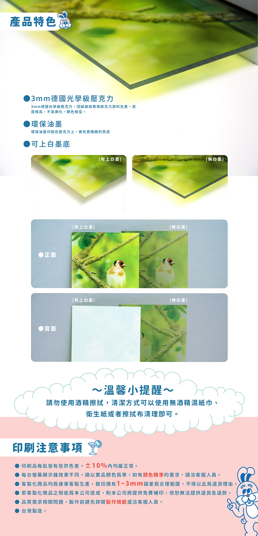 特色: * 3mm德國光學級壓克力,頂級裱框專用壓克力原料生產,透度極高,不易黃化,顯色極佳 * 環保油墨印刷在壓克力上,擁有更精緻的質感
