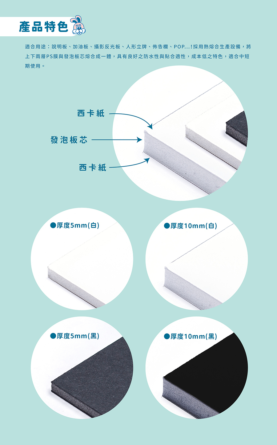 採用熱熔合生產設備,將上下兩層卡紙與發泡板芯熔合成一體,具較硬挺的質感與更堅固的貼合,適合中短期使用。