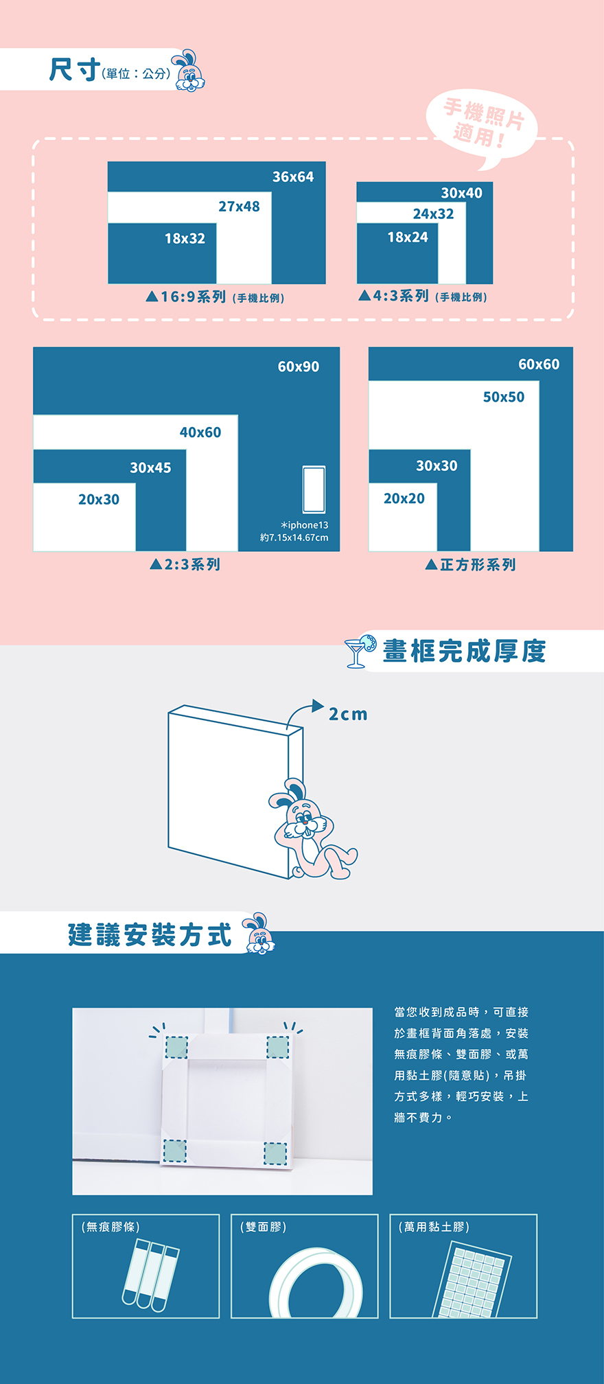 可用黏土、魔鬼氈、水晶膠、無痕掛勾膠、釘子等掛於牆面。綠建材環保無毒認證墨水,國際G7&BrandQ雙色彩認證相片品質 1000dpi超高解析印製,材質輕盈安全環保,立即打造完美住居!