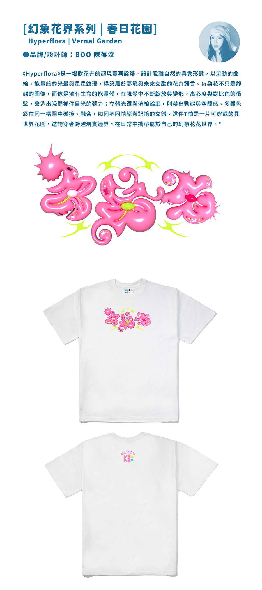 《Hyperflora》是一場對花卉的超現實再詮釋。設計脫離自然的具象形態,以流動的曲線、能量般的光暈與星星紋理,構築屬於夢境與未來交融的花卉語言。每朵花不只是靜態的圖像,而像是擁有生命的能量體,在視覺中不斷綻放與變形。高彩度與對比色的衝擊,營造出瞬間抓住目光的張力;立體光澤與流線輪廓,則帶出動態與空間感。多種色彩在同一構圖中碰撞、融合,如同不同情緒與記憶的交錯。這件T恤是一片可穿戴的異世界花園,邀請穿者跨越現實邊界,在日常中攜帶屬於自己的幻象花花世界。"
