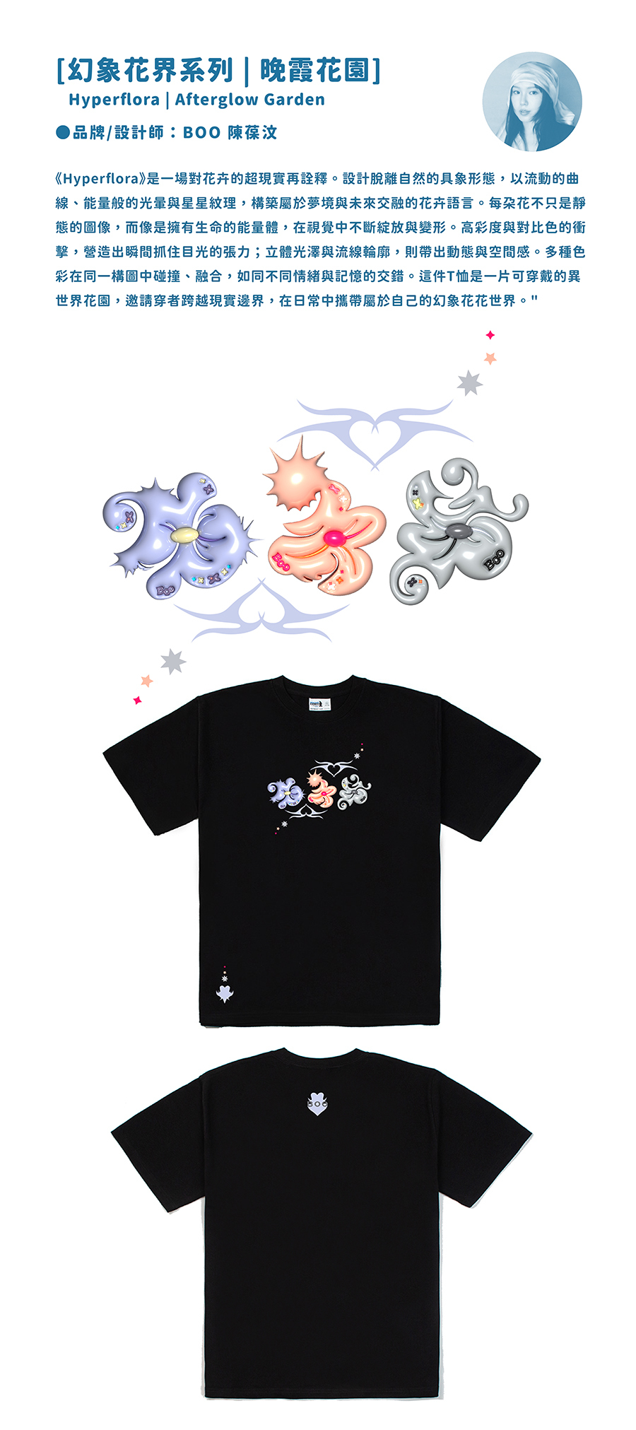 《Hyperflora》是一場對花卉的超現實再詮釋。設計脫離自然的具象形態,以流動的曲線、能量般的光暈與星星紋理,構築屬於夢境與未來交融的花卉語言。每朵花不只是靜態的圖像,而像是擁有生命的能量體,在視覺中不斷綻放與變形。高彩度與對比色的衝擊,營造出瞬間抓住目光的張力;立體光澤與流線輪廓,則帶出動態與空間感。多種色彩在同一構圖中碰撞、融合,如同不同情緒與記憶的交錯。這件T恤是一片可穿戴的異世界花園,邀請穿者跨越現實邊界,在日常中攜帶屬於自己的幻象花花世界。"