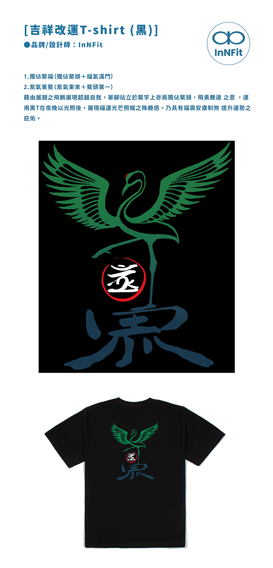 藉由展翅之飛鶴展現超越自我,單腳站立於鰲字上亦為獨佔鰲頭,飛黃騰達 之意 ,運用黑T在夜晚以光照後,展現福運光芒照耀之殊勝感。乃具有福壽安康制煞 提升運勢之庇佑。