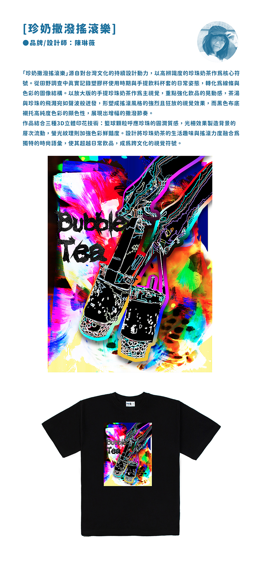 作品結合三種3D立體印花技術:籃球顆粒呼應珍珠的圓潤質感,光柵效果製造背景的層次流動,螢光紋理則加強色彩鮮豔度。設計將珍珠奶茶的生活趣味與搖滾力度融合為獨特的時尚語彙,使其超越日常飲品,成為跨文化的視覺符號。